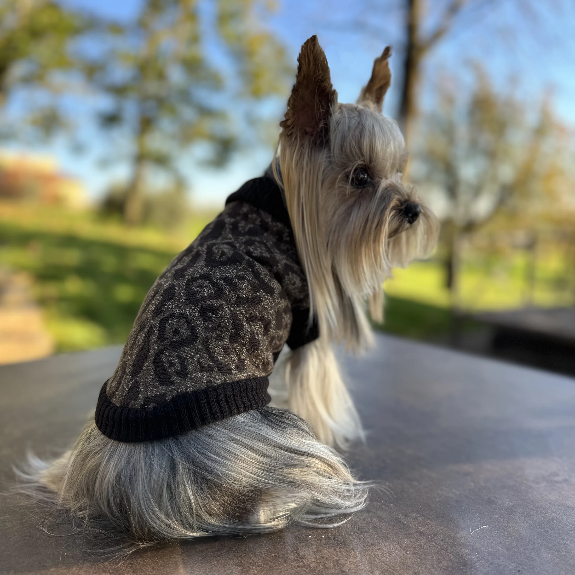 Questo stilosissimo maglioncino per cani leopardato in jacquard  è perfetto per uno stile deciso e alla moda. Un capo esclusivo per i piccoli pelosetti di casa che vogliono distinguersi con stile e classe. É realizzato interamente a mano in Italia con un mix di pregato cashmere e lana.